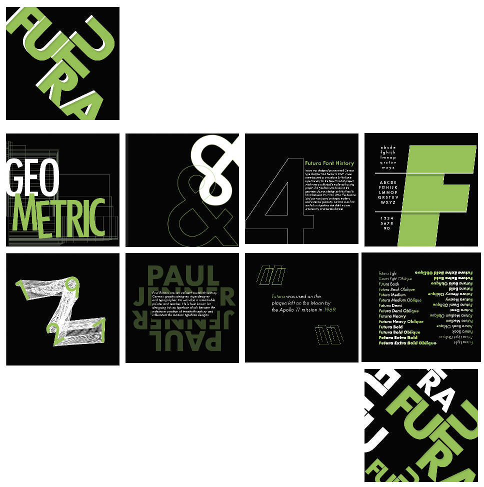 Ultimately, I opted for Futura, driven by its contemporary appeal and the creative possibilities it offered for crafting futuristic artwork. The expansive font family of Futura gave me greater artistic freedom. This choice also went seamlessly with my color palette selection, as I aimed to strike a balance between eye-catching visual elements and that complemented the sleek and modern sensibilities of Futura.